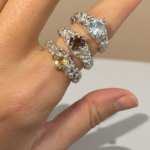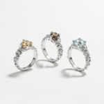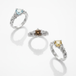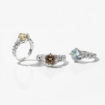 Skulptūriškos formos žiedai su subtiliai spindinčiais apvaliais akmenimis. Moderni prabanga, išraiškingos detalės ir elegancija, kuri išlieka.
